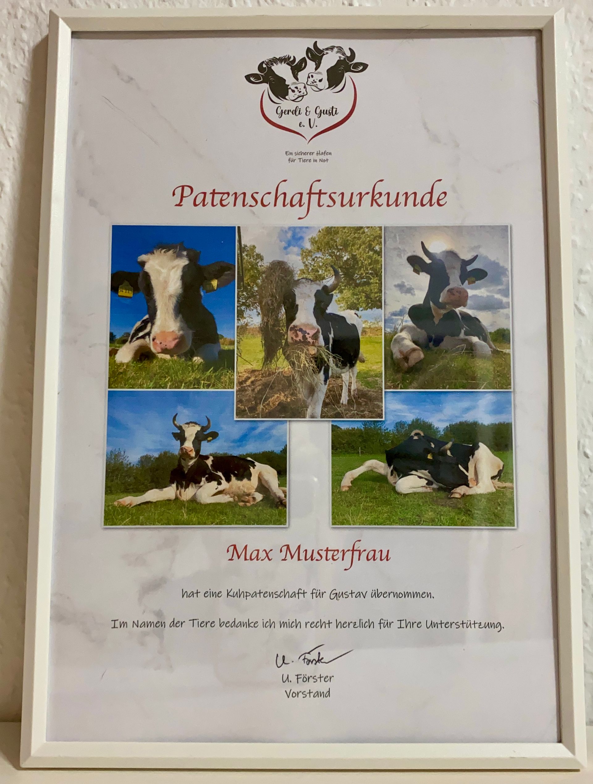Ihre Patenschaftsurkunde enthält Fotos Ihres/r Schützlings/e, wird auf Urkundenpapier gedruckt und mit einem weißen Rahmen an Sie verschickt.